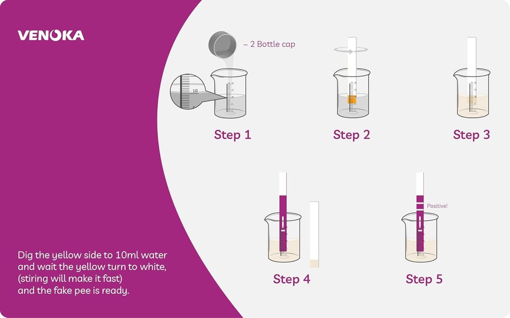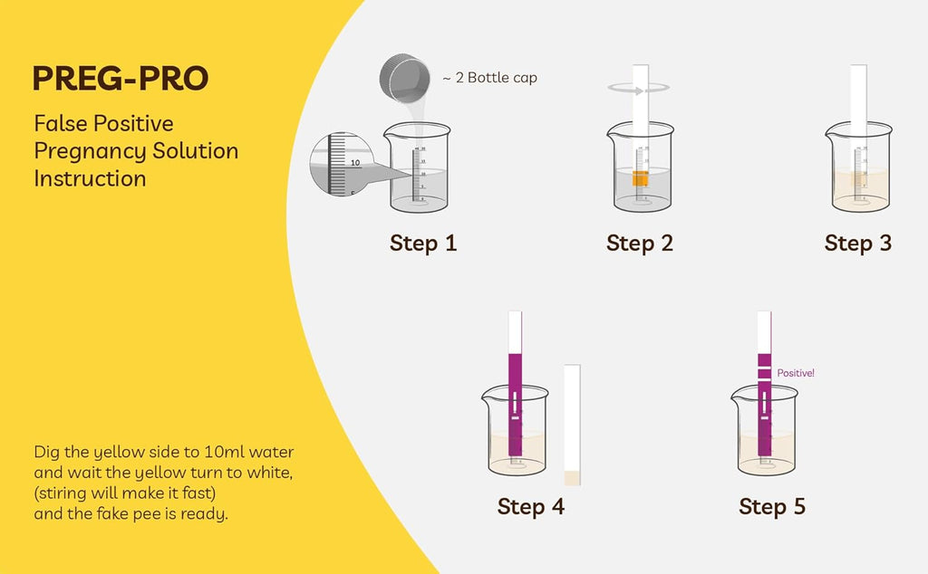 - Easy to use to prepare positive pregnancy test liquid. Dig the yellow side to 10ml water and wait the yellow turn to white (stiring will make it fast)and the fake pee is ready.