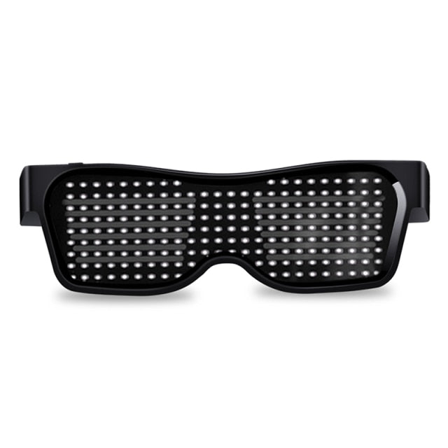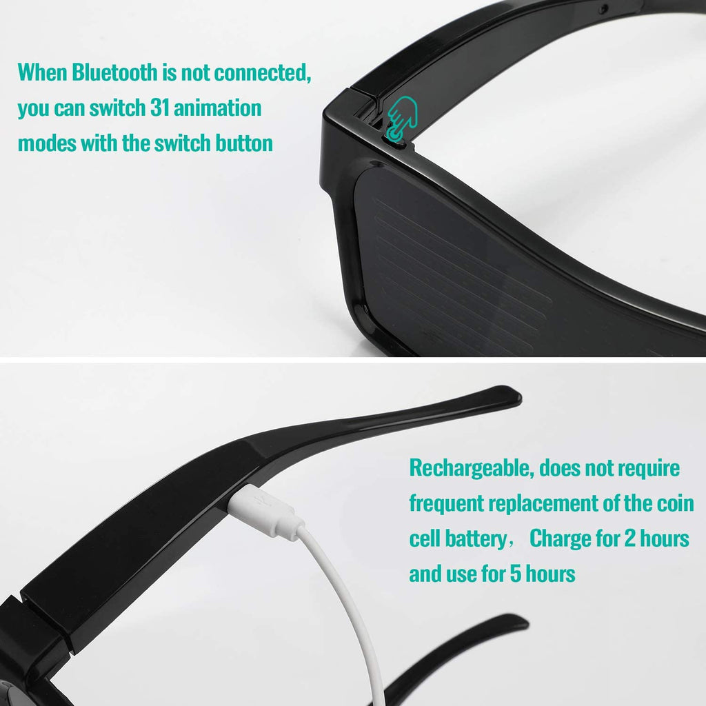 • Rechargeable App Controlled LED Glasses - Controlled by APP LED glasses are controlled by APP. You can scan the QR code on the manual instruction or search the "Funky Glasses" on the APP store to download it. When the glasses are connected with Bluetooth you can choose the pattern you like to show on the glasses.