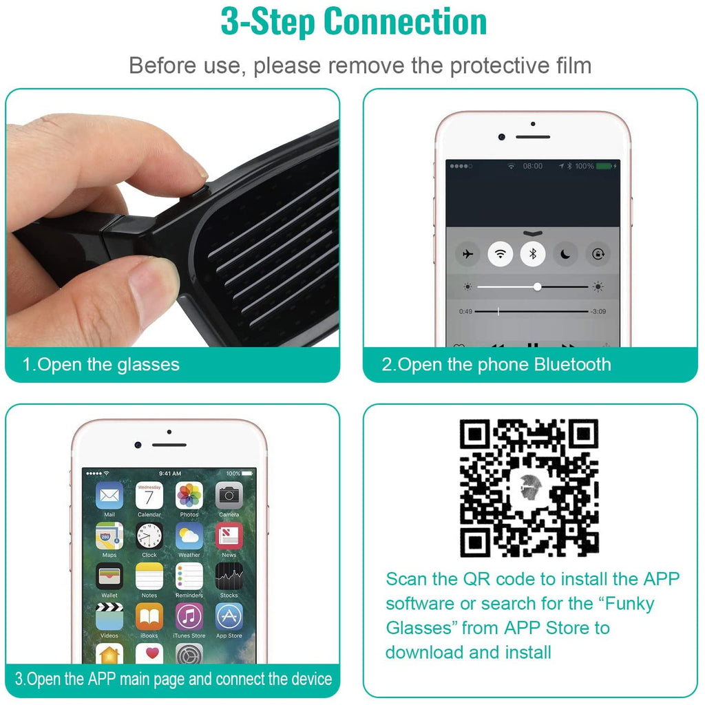 • Ways to Use: First, download the APP(Funky Glasses), long-press the button(on the top of the glasses frame) for 3 seconds to turn on the glasses, and open the Bluetooth. Second, open the APP page and search Bluetooth and click the button to connect it. Third, After the APP and glasses are connected, you can choose a display pattern to show.