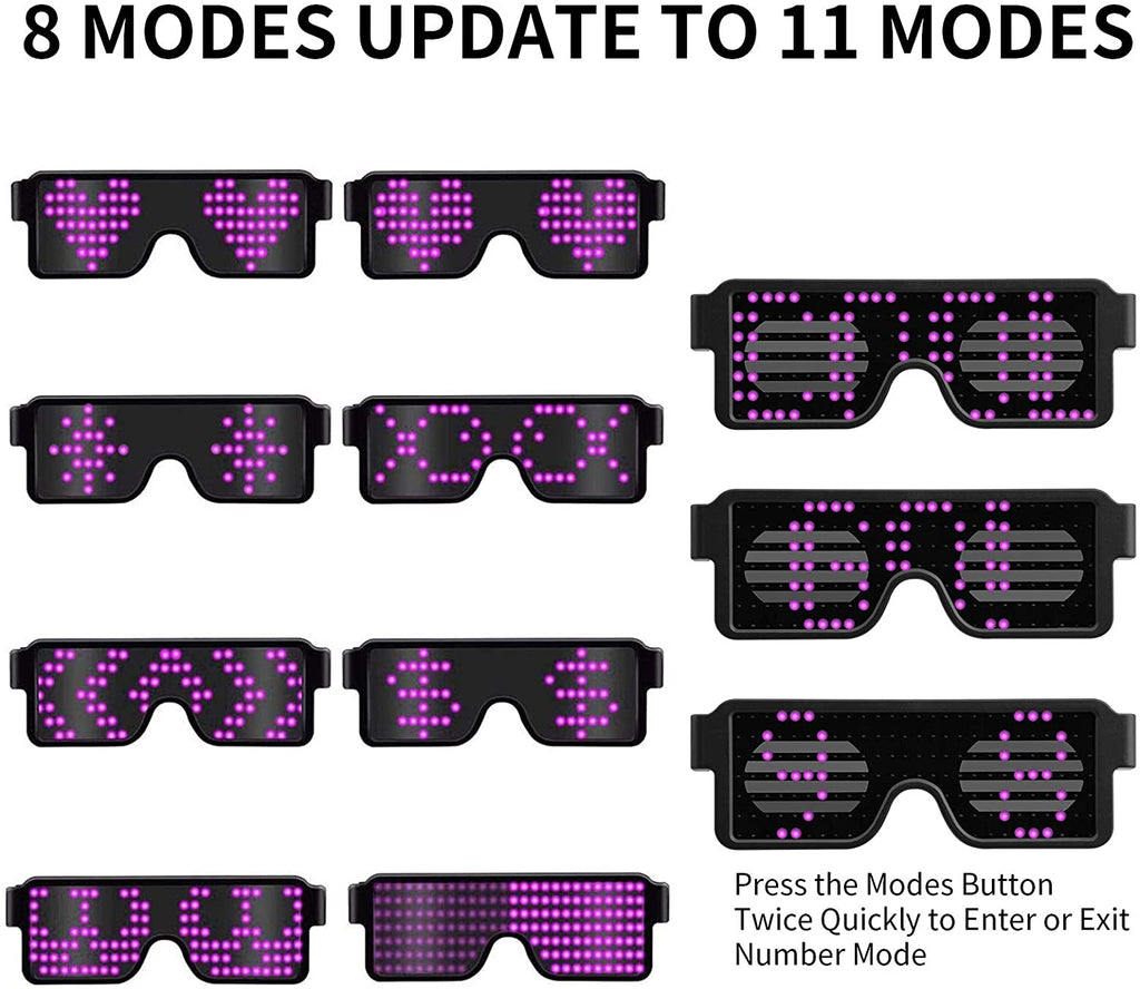 • Updates to 11 Glowing Modes LED light-up glasses to update to 11 glowing modes from 8 modes, like fish /fireworks /dollars /flow /skull /heartbreak /flashing /heart, and new 3 modes are GO!, COOL and number. Press button 3-4s to turn on/off, press the on/off button to change the mode. And press the Modes Button Twice Quickly to Enter or Exit Number Mode.